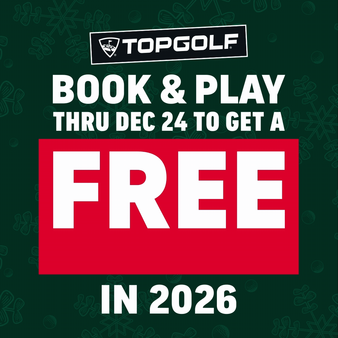 | TERMS AND CONDITIONS: *PROMOTIONAL. Free one (1) hour of Topgolf game play for Players who purchase one (1) or two (2) bay reservations, or event packages of two (2) or more bays, through the Topgolf App or website for visits occurring 12/15/25–12/24/25. The free one (1) hour of game play coupon is redeemable only from 1/1/26–2/28/26. The free one (1) hour of Topgolf game play coupon will be emailed on 1/1/26 to the email address associated with the booking. If an eligible online reservation is canceled, the coupon will not be issued. The game play coupon is redeemable for reservations made through the Topgolf App or website or for walk-ins (not valid for 2+ bay bundles or event products). For reservations made via the Topgolf App or website, the coupon must be applied at the time of booking (not redeemable at the bay). To redeem the coupon during a walk-in visit, the coupon must be applied on the bay screen during sign-in. If a walk-in group of Players wishes to split up and use multiple bays during a visit, only one (1) one-hour game play coupon may be used by the group as a whole, unless the need for multiple bays is due to the group size exceeding the maximum bay capacity for Players (six (6) people), in which case one (1) one-hour game play coupon may be used for all maximum-capacity bays and up to one (1) additional bay that is not at maximum capacity. Not redeemable for Topgolf event products. For new Players, a Topgolf Lifetime Membership (one-time cost of $6) is required to redeem the one-hour game play coupon. Only one (1) one-hour game play coupon is valid per bay. Limit one (1) one-hour game play coupon per person; cannot be reused once redeemed. Cannot be combined with any other game play coupon. No cash value. Offer valid at participating U.S. Topgolf locations only. Not valid at Lounge, Swing Suite, or Toptracer Range locations. Excludes arcade games. Void where prohibited. Offer subject to change. NYE Terms: Topgolf NYE 2026 is open to walk-in, standard reservations, and NYE ticket purchase, availability of options varies by venue. Ticket purchase applies to the night of 12/31/25 starting at 9 p.m., through 1 a.m. 1/1/26. A maximum of 6 people per bay are allowed. NYE tickets available while supplies last. NYE tickets cannot be combined with any coupon, offer or promotion. Cancellations with refunds will be available through 12/26/25 at 11:59 p.m. After 12/26/25 cancellations will happen without refund. Topgolf NYE 2026 is available at only participating Topgolf venues. Visit topgolf.com/NYE to confirm your venue is hosting Topgolf NYE 2026. Topgolf Las Vegas will host a slightly different NYE party. Check out Topgolf Las Vegas’ NYE party details here. For Topgolf venues which are not participating in the Topgolf NYE 2026 party, walk-in and standard reservations can still be made (subject to availability). NYE Promo Terms: PROMOTIONAL. Free one (1) hour of Topgolf game play to Players who purchase a New Year’s Eve ticket prior to December 23, 2025. Free hour of Topgolf game play coupon is only redeemable from 1/1/26 - 2/28/26. Free hour of Topgolf game play coupon will be emailed on 1/1/26 to the email address where the ticket purchase was sent. If an eligible ticket purchase is made but canceled, no coupon will be granted. Game play coupon is redeemable for reservations made through Topgolf’s App or website or walk-ins (not valid for 2+bay bundles or event products). For reservations made via Topgolf’s App or website, coupon must be applied at the time of booking (not redeemable at the bay). To redeem coupon during walk-in visit, coupon must be applied on the bay screen during sign in. If a walk-in group of players wishes to split up and use multiple bays during a visit, only (1) one hour game play coupon may be used by the group as a whole unless the need for multiple bays is due to the group size being above the max bay capacity for Players (6 people), in which case one (1) one hour game play coupon may be used for all maximum capacity bays and up to one (1) additional bay that is not at max capacity. Not redeemable for Topgolf event products. For new Players, a Topgolf Lifetime Membership (one-time cost of $6) is required to redeem the one-hour game play coupon. Only one (1) one hour game play coupon valid per bay. Limit one (1) one hour game play coupon per person, cannot reuse once redeemed. Cannot be combined with any other game play coupon. No cash value. Offer valid at participating U.S. Topgolf locations only. Not valid at Lounge, Swing Suite or Toptracer Range locations. Excludes arcade games. Void where prohibited. Offer subject to change. |